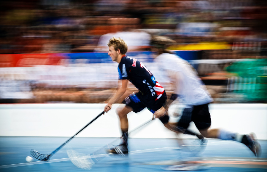 Czech Open 2010 je pravidelný a největší florbalový turnaj v ČR, jednotlivé zápasy se hrají v různých halách po Praze a finálový den vrcholí tradičně v Toyota aréně na Výstavišti. Florbalové hřiště je podstatně menší než hokejové a s objektivem 200 mm není problém jej pokrýt celé. Samozřejmě lze použít i jiná ohniska – třeba rybí oko v rohu. Světlo závisí na konkrétní hale, v Toyotě je poměrně slušné: 1/640s, f3,2, ISO 2500. Jinak platí prakticky to samé jako pro hokej, viz Velká kniha sportovní fotografie.