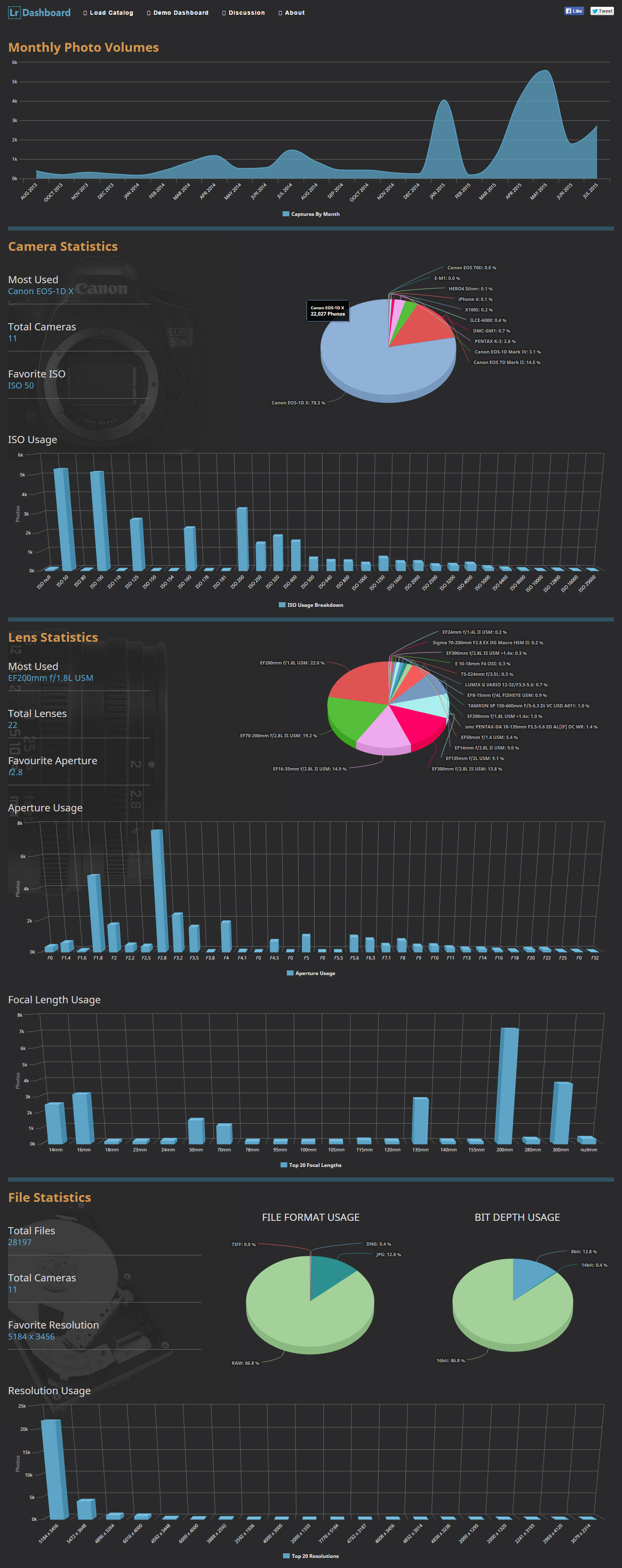 Objevila se nová služba Lightroom Dashboard, která umí načíst a vizualizovat data z vašeho Lightroom katalogu. Stačí otevřít výše odkazovaný web a přetáhnout do prohlížeče soubor s katalogem (.lrcat). Během chvilky se vám zobrazí statistiky: