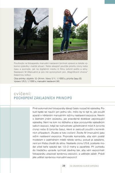 První věc na cestě k pochopení principů fotografování a zároveň třetí kapitola knihy se jmenuje Expozice. Přesně jak byste čekali, zde najdete vysvětlení expozičních parametrů, a jak spolu souvisí. Pěkná je zejména ta část, kde autor ukazuje šest správných expozic, z nichž jen jedna je kreativní, včetně cvičení, jak se naučit kreativně exponovat. Chybí mi tu třeba vysvětlení automatického měření expozice a využití kompenzace expozice, naštěstí to autor dožene v 7. oddílu.