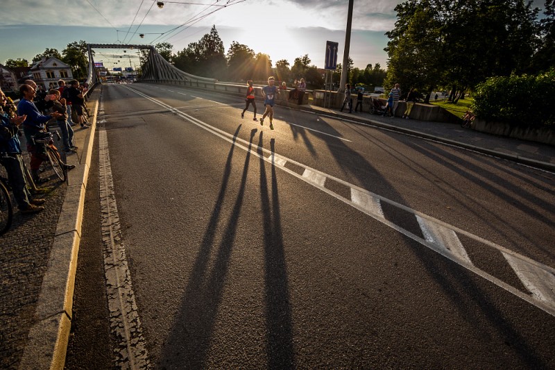 Pestrobarevná lidská řeka první stovky metrů po startu (než se startovní pole příliš roztrhá) je extrémně fotogenická a nejlépe se zabírá z nějakého vyvýšeného místa nad tratí. V době startů na Karlově mostě vypadaly skvěle snímky například ze Staroměstské mostecké věže. Rozhodně vyzkoušejte dlouhý čas, klidně i dvě sekundy; výsledným efektem budete mile překvapeni. A nezapomeňte si na něj vzít stativ – ideální je ministativ, u kterého vám nebude vadit, že ho budete muset další dvě hodiny nosit na zádech.